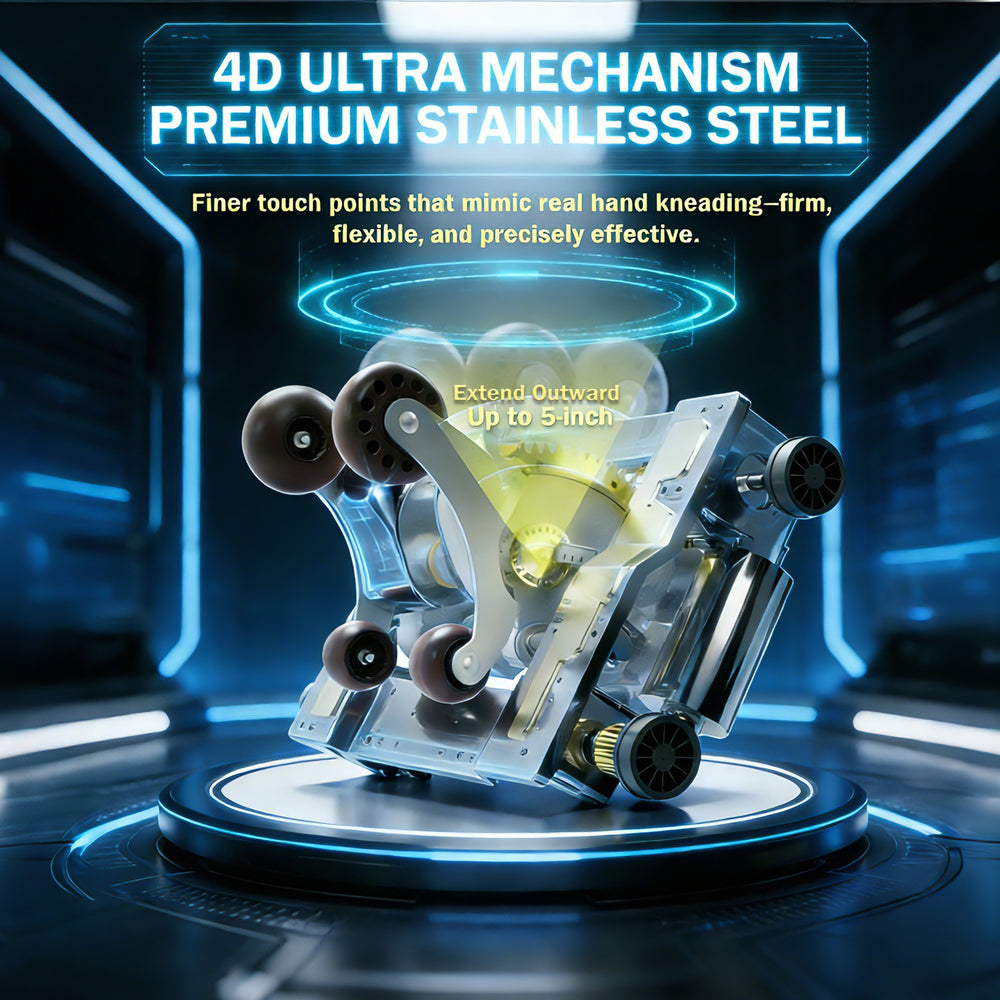 Twice the rollers, double the comfort. Our upgraded 4D + 3D dual system eliminates massage "blind spots" by covering your entire back simultaneously. From the cervical spine to the tailbone, enjoy a deeper, faster, and more effective recovery session powered by synchronized mechanical precision.