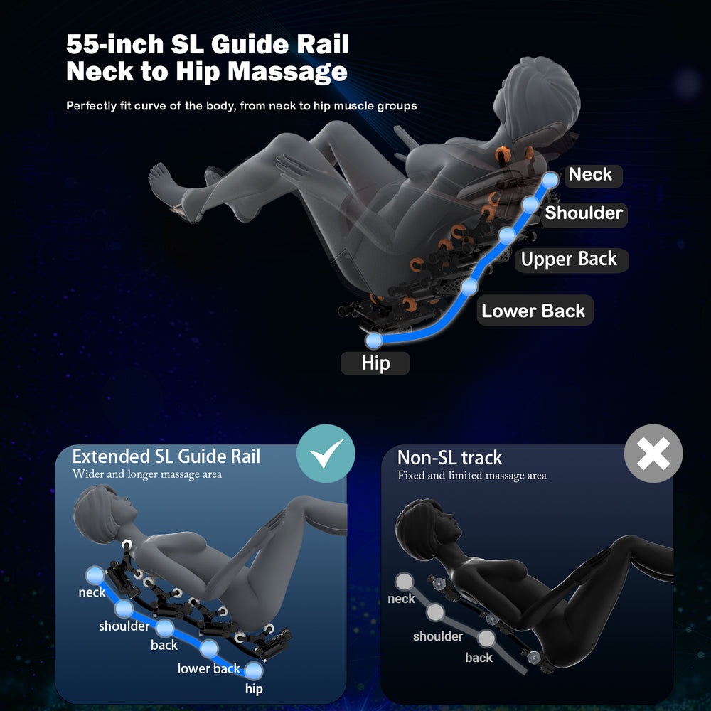 Engineering precision that follows your natural curve. Unlike standard fixed tracks, our 55-inch Extended SL-Track provides a continuous, seamless massage journey from your neck and shoulders all the way to your hips. By perfectly mirroring the body's "S" and "L" curves, it ensures every muscle group receives professional-grade pressure without any dead zones.