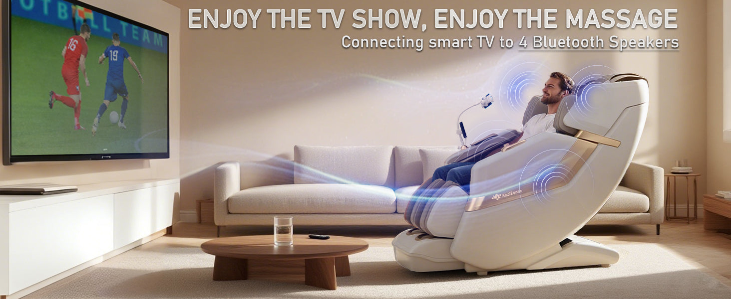 Recline into true zero gravity position as the chair tilts to elevate your knees above your heart, taking pressure off your spine and promoting healthy blood circulation throughout your body β especially beneficial for those who struggle with leg swelling or fatigue after long hours on their feet. But this chair doesn't just work on your body; it works on your mind too. The integrated Bluetooth system connects seamlessly to your devices and fills the room with immersive, surround sound through 4 built-in speakers, while 15 carefully curated built-in music tracks set the perfect tone for deep relaxation. Close your eyes, let the chair do its work, and you'll forget you're at home β it feels just like a day at the spa.