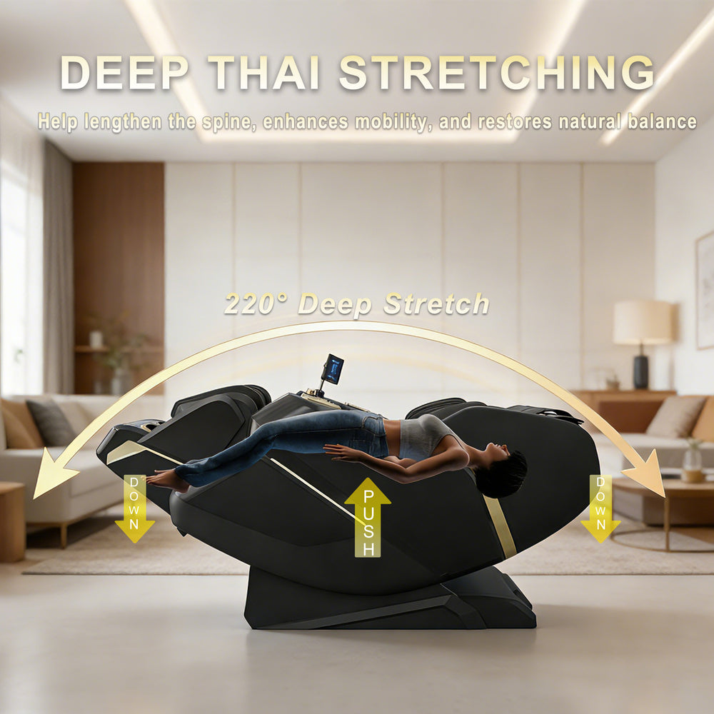 Restore your bodyβs natural balance with our signature Deep Thai Stretching program. This 220-degree full-body arch helps lengthen the spine and enhance overall mobility. By gently pushing the midsection upward while reclining the extremities, the chair effectively decompresses the vertebrae and revitalizes your core flexibility.
