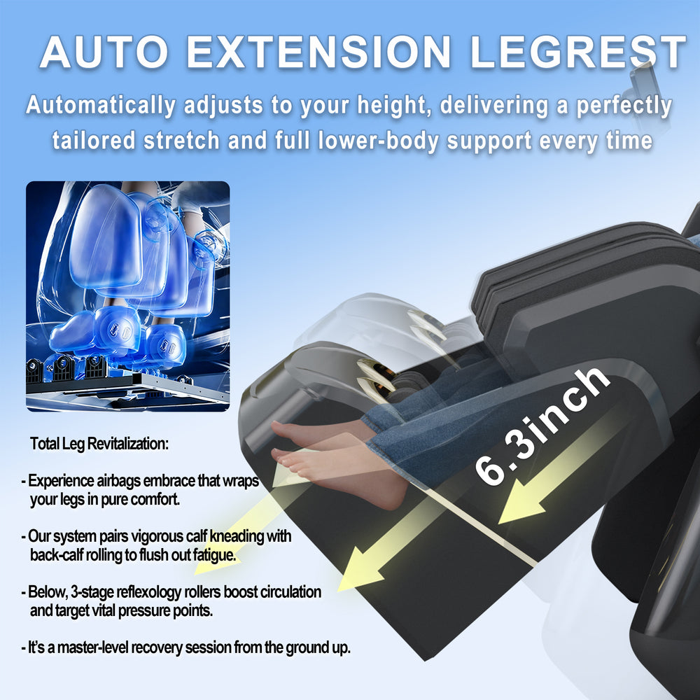 Enjoy a perfectly tailored fit every time with our Auto Extension Legrest. The system automatically senses your height and adjusts up to 6.3 inches, ensuring full lower-body support and an optimized stretch. Combined with calf kneading and 3-stage reflexology rollers, it provides a synchronized recovery session for tired legs.