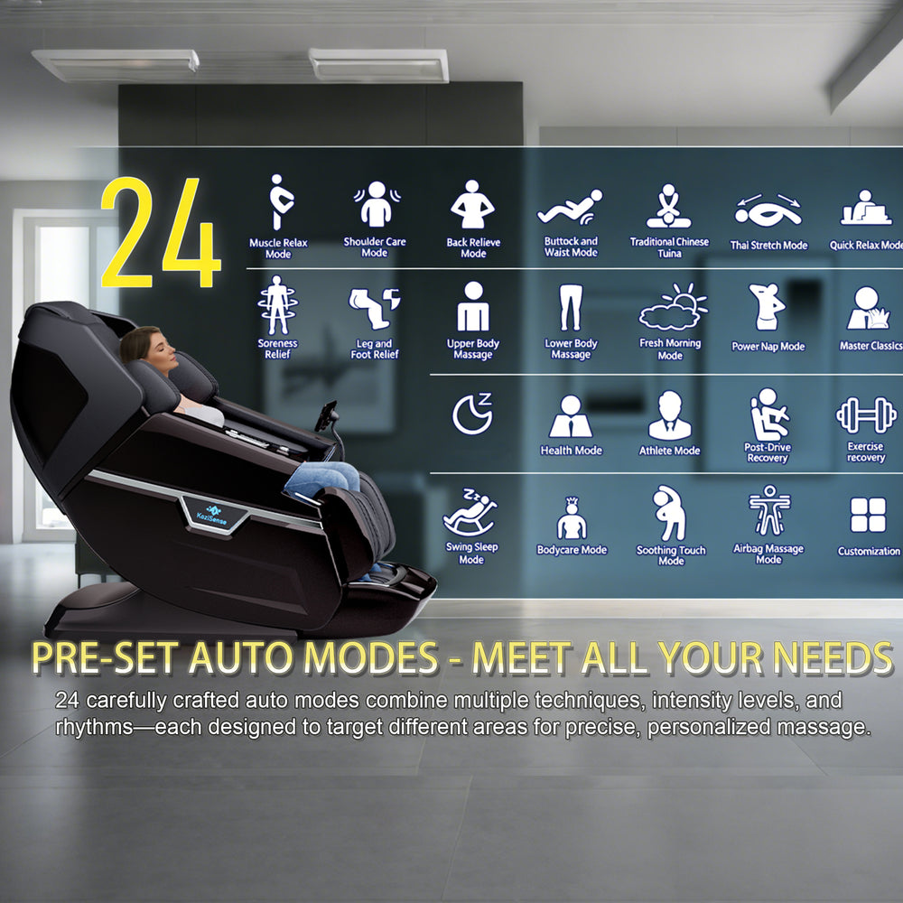 One chair, endless possibilities. Choose from 24 expertly designed modes to match your mood and physical condition. With specialized options for "Swing Sleep," "Athlete Mode," and "Airbag Massage," the KoziSense offers a bespoke spa experience for every member of the family.