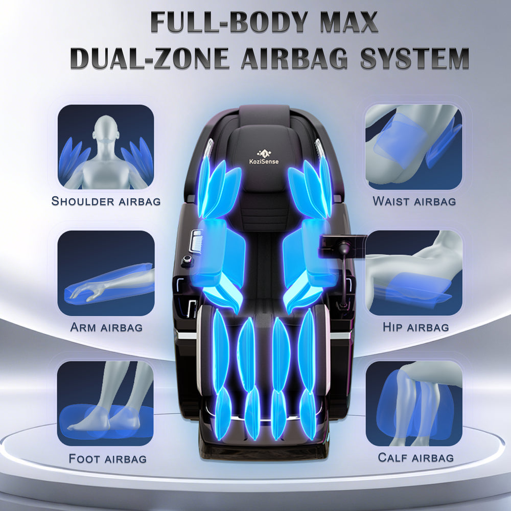 Surround yourself in a cocoon of comfort. The KoziSense airbag system mimics the rhythmic squeezing of a professional therapist, providing a full-body massage that leaves no area untouched. Whether it's the gentle shoulder stabilization or the deep calf and foot compression, this intelligent system adapts its intensity to your preference, melting away the day's stress and promoting profound relaxation from head to toe.