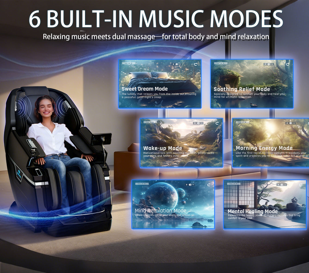 Escape the noise of the world with specialized relaxation programs tailored to your mood. From the tranquil "Soothing Relief Mode" to the profound stillness of "Mind Relaxation Mode," each session combines therapeutic touch with motivational audio talk or calming melodies. It’s more than a massageβ€”it’s a private sanctuary for your soul.